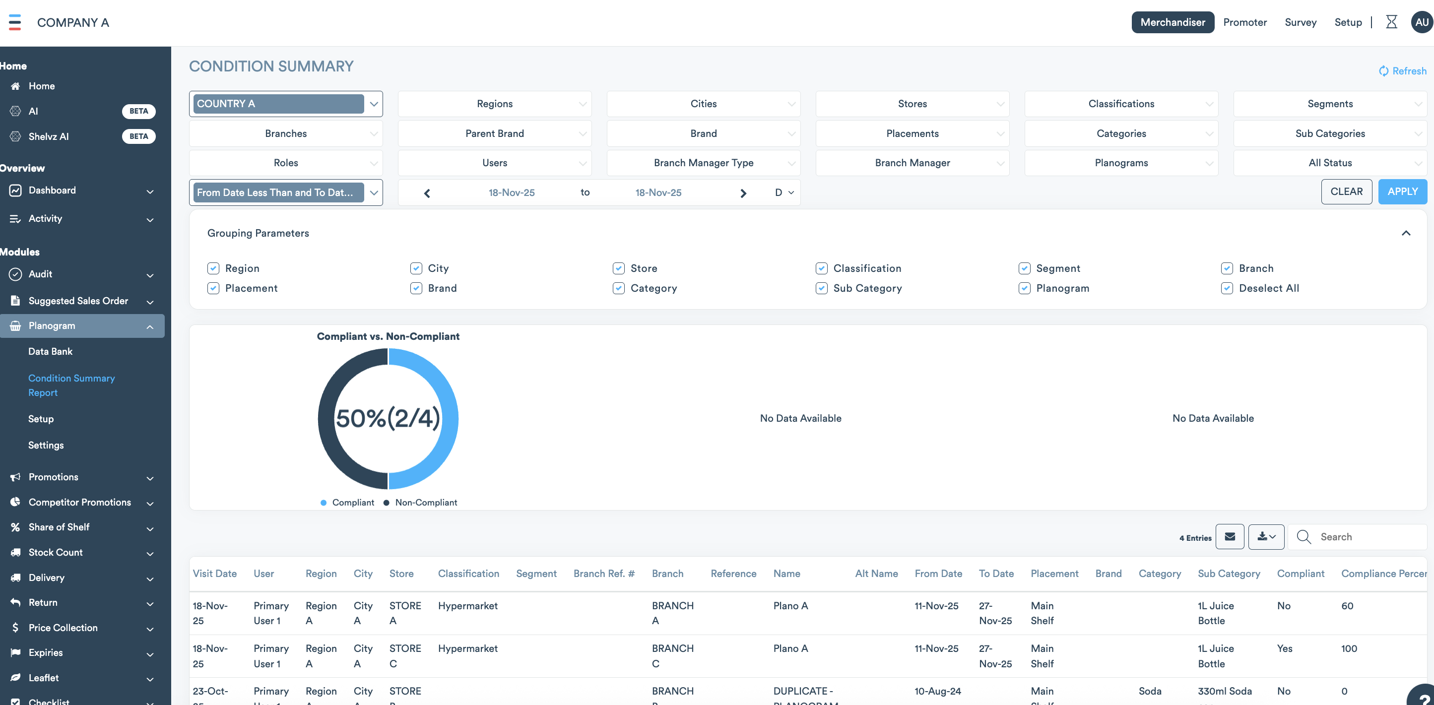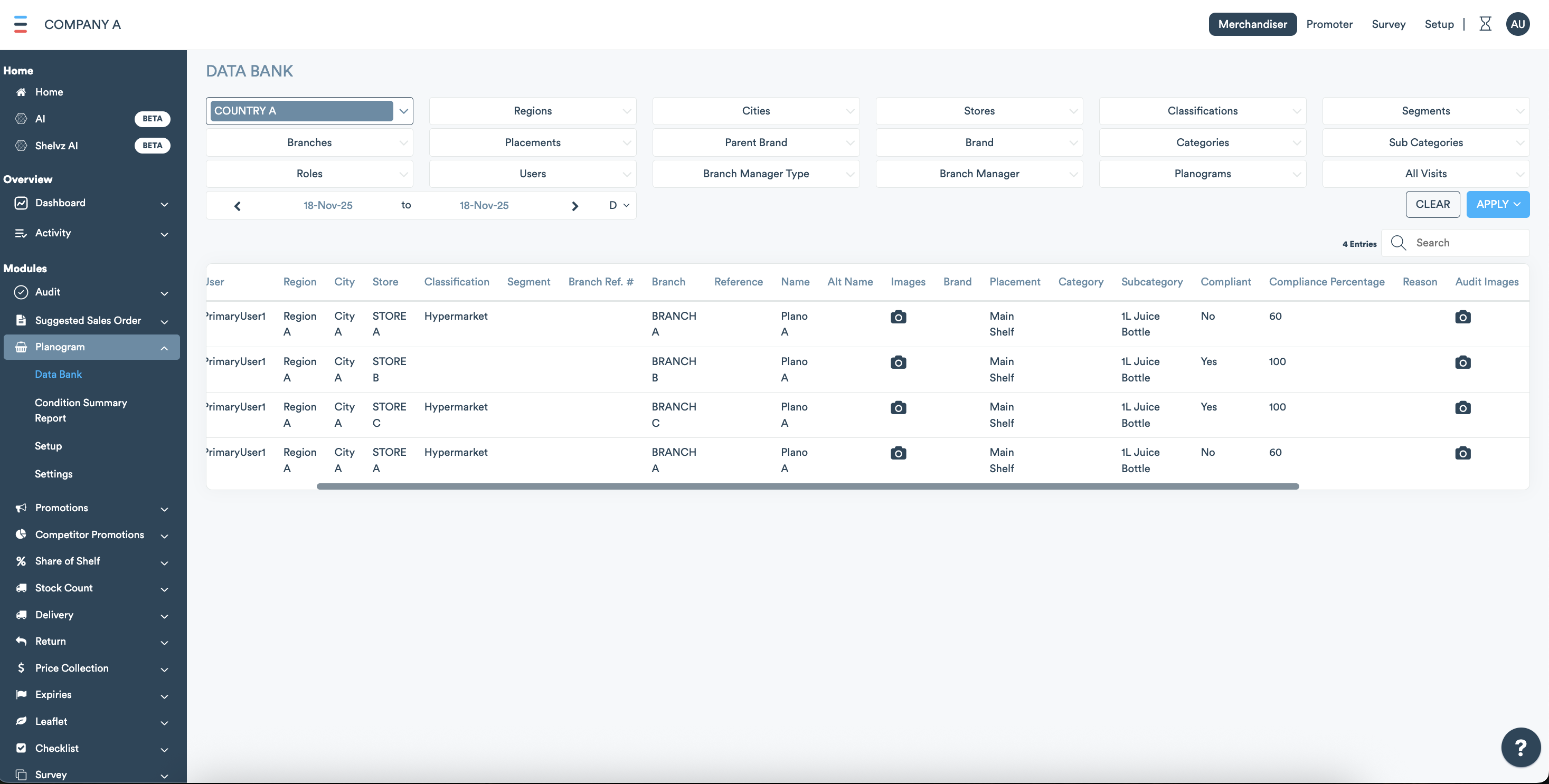 The Planogram module is designed to help ensure that store shelves and displays follow the approved planogram standards. Its main goal is to verify that products are placed in the correct locations, in the right quantities, and with proper visibility, as defined by the company’s merchandising guidelines.