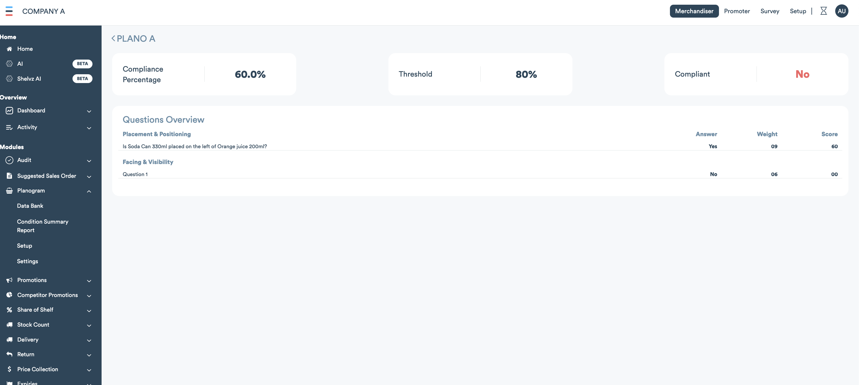 For a better compliance measurement, you can add the planogram rules as yes/no questions using our questions template or customized ones which will be used to measure the overall planogram compliance